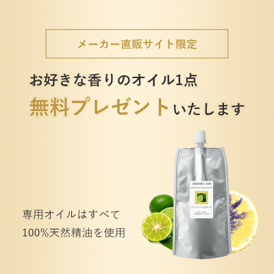 専用オイル100ml送料無料 4,990円(税込) [10%OFF] 専用オイル100ml定期購入送料無料 4,490円(税込) 商品仕様 成分 成分:天然精油 精油抽出法:圧搾法、水蒸気蒸留法 オイル容量 50ml 芳香床面積 6畳〜40畳 強弱調整 3段階 強(連続)、中(70%間欠)、弱(40%間欠) 搭載機能 オフタイマー、 オートスイッチオフ(消し忘れ防止)、残量センサーランプ 電源 専用ACアダプター(USB対応) 消費電力 2W 製品寸法 高さ230mm×直径120mm 本体重量 940g 主な材質 本体部(アルミ)、本体内部(ABS)、オイルビン(ガラス)、オイルビンキャップ部(POM)、オイルパッド(不織布) 内容物 本体、オリジナル精油50ml、交換パッド、オイルビンセット(100mlサイズ)、ACアダプター、保証書・取扱い説明書アロマディフューザー アロミック・エアー 好きな空間で、好きな時に好きな香りを。